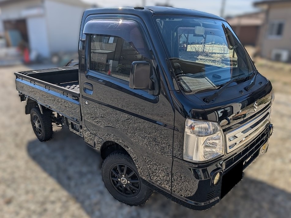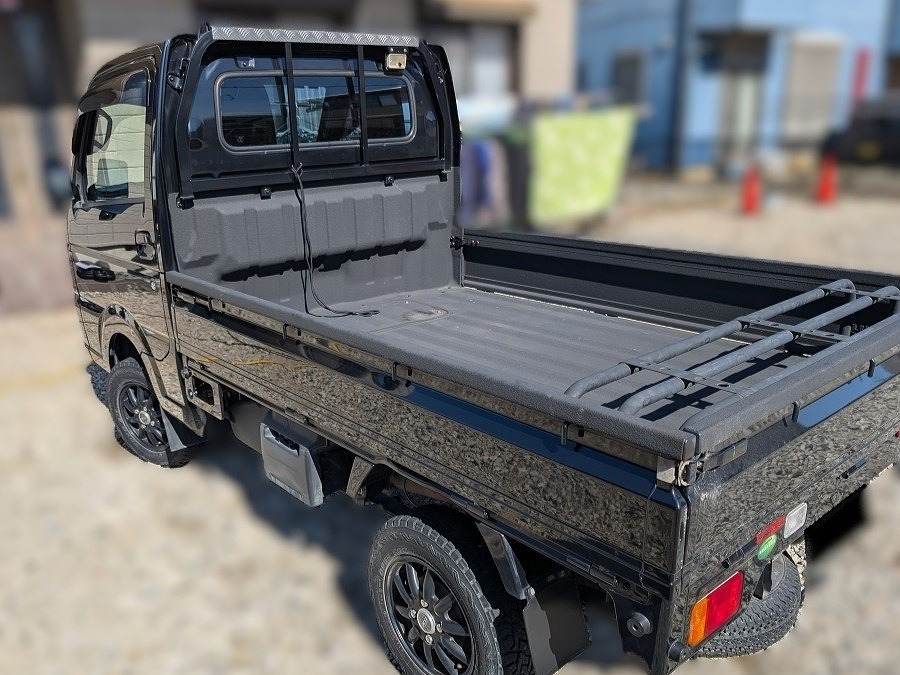 H30年式、キャリートラック(DA16T)でオートマ、FR、NAモデルがベースです。外装は純正のブラックでリフトアップし社外ホイールを履いています。荷台はキズなどの付きにくいLINE-X塗装が施工されています。走行距離が少なく、キレイに乗られている改造車のため精一杯の金額をご提示し買取できました。