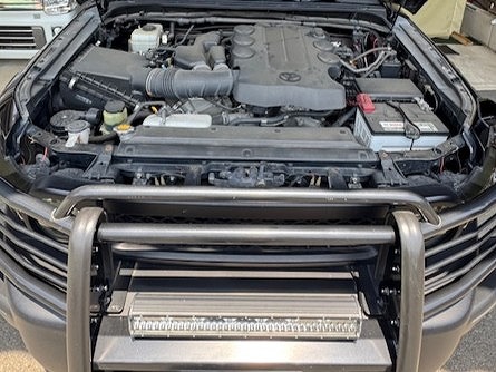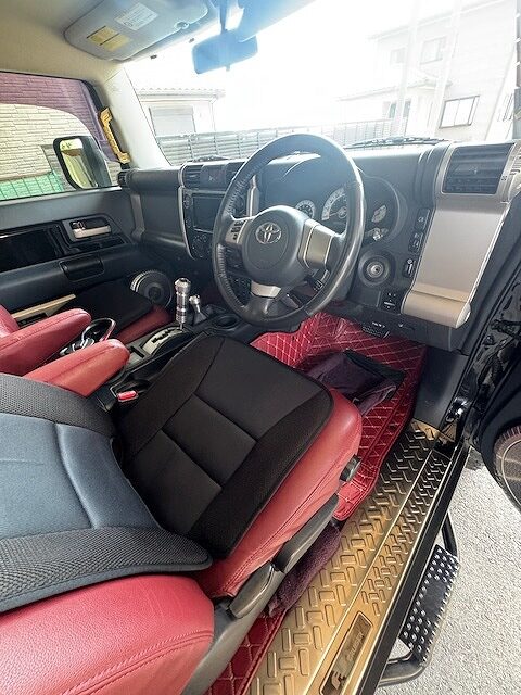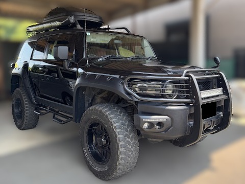 H23年式、走行14.2万㎞のFJクルーザー(GSJ15W)のカスタムカーになります。大きな改造点は外装になり、社外のショック&スプリングを使いリフトアップし、バンパー、ヘッドライト、フェンダーなどをUS仕様の変更、社外のバンパーガード&ホイールなどを組みドレスアップしてあります。内装は社外のレザーシートカバーやスカッフプレートが装着されています。走行14.2万㎞ですが内外装、機関良好で迫力あるスタイルに仕上げてあるためカスタムした価値を精一杯プラスし買取しました。